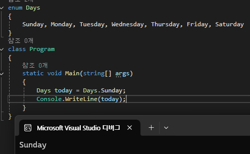 - 따라서 예제 코드의 Sunday는 숫자0이고, 그 이후로 1, 2, 3, ...과 같은 식으로 증가해 Saturday는 6이 되어 결국 상속받은 System.Int32 타입에 해당하는 값이 된다.