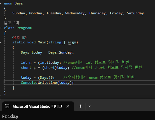 - enum의 조상이 System.Object임을 감안하면 enum은 ToString 메서드를 재정의햇고, 그것의 내부 코드에서 숫자값보다는 문자열로 반환하는 역할을 하기 때문이다.