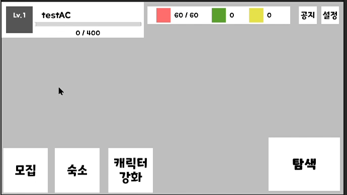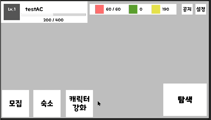 반면, 탐색을 제외한 하단 버튼들(캐릭터 뽑기, 강화, 상점 등)은 아직 미구현 상태이며, 상단의 설정과 공지 기능 또한 구현되지 않았다.