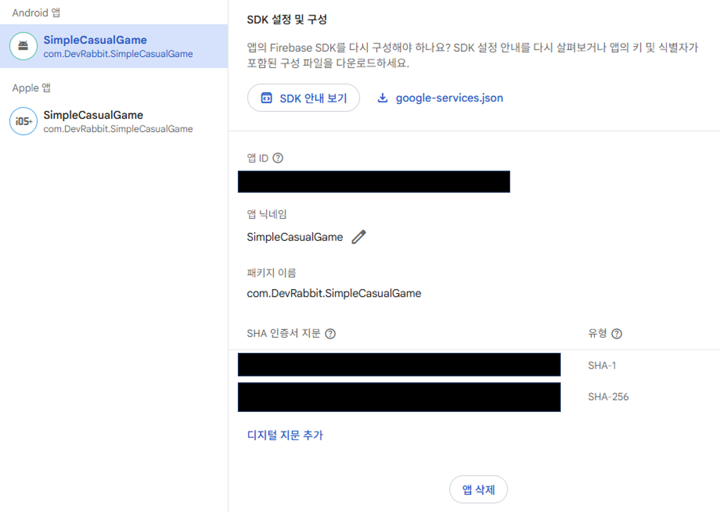 Google 로그인을 사용하려면 Firebase 콘솔과 Google Cloud 콘솔에 SHA1 및 SHA256 키를 정확하게 등록해야 한다. 이 키들이 등록되어 있어야 Google 인증서가 Unity 앱을 ‘정상적인 앱’으로 인식하고 로그인 요청을 처리할 수 있다.