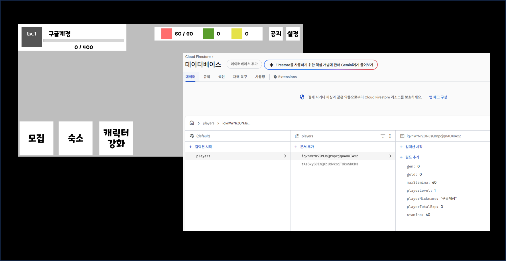 이렇게 발급된 UID를 기반으로 Firestore와 연동해 플레이어의 기본 정보, 진행 상황, 보유 캐릭터 등의 데이터를 저장할 수 있는 구조를 구성했다.