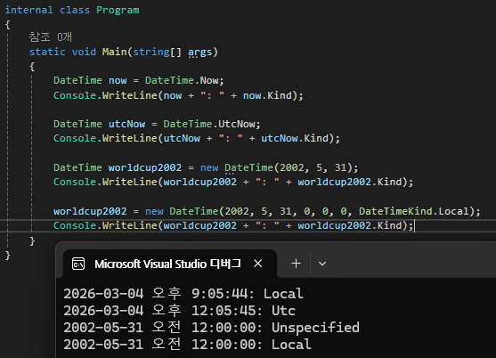 첫 번째 worldcup2002 변수에 담긴 2002년 5월 31일은 시간대가 정해지지 않았으므로 이 값은 지구의 경도마다 제각기 해석될 수 있는 여지를 남긴다. 따라서 DateTime 타입의 인스턴스를 생성자를 통해 직접 만들 때는 반드시 그 시간이 UTC 기준인지, 지역 시간 기준인지 명시하는 것을 권장한다.