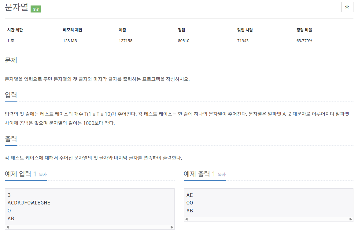 //각 문자열의 첫 문자와 마지막 문자를 인덱스로 접근해 출력