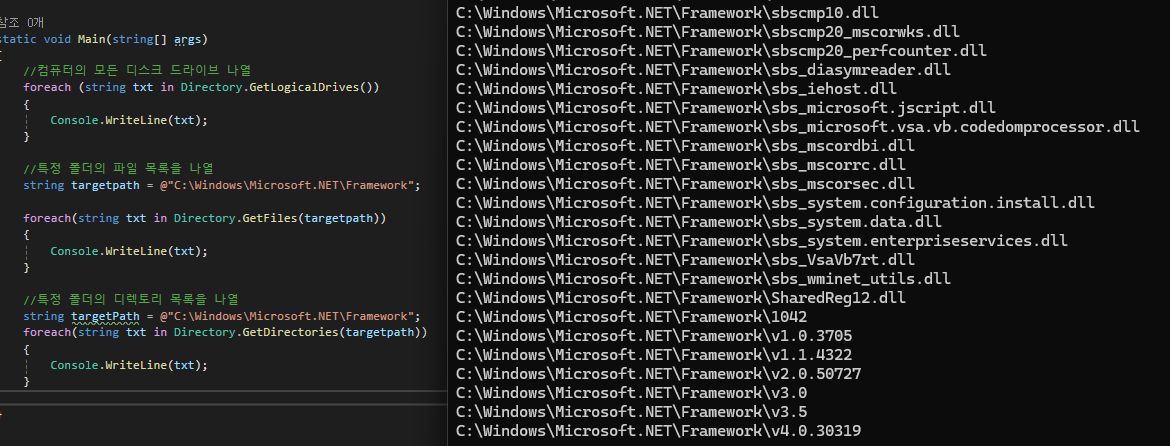 | GetDirectories | 지정된 경로의 하위 디렉토리 목록을 문자열 배열로 반환한다. |
