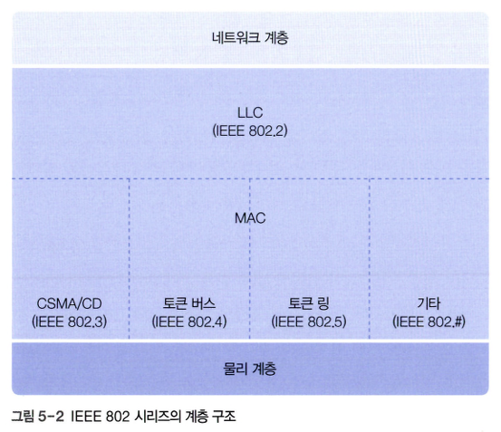 - LAN 환경에서는 네트워크 자원을 효율적으로 활용하려고 데이터링크 계층의 기능을 LLC 계층과 MAC 계층으로 나누어 처리한다.