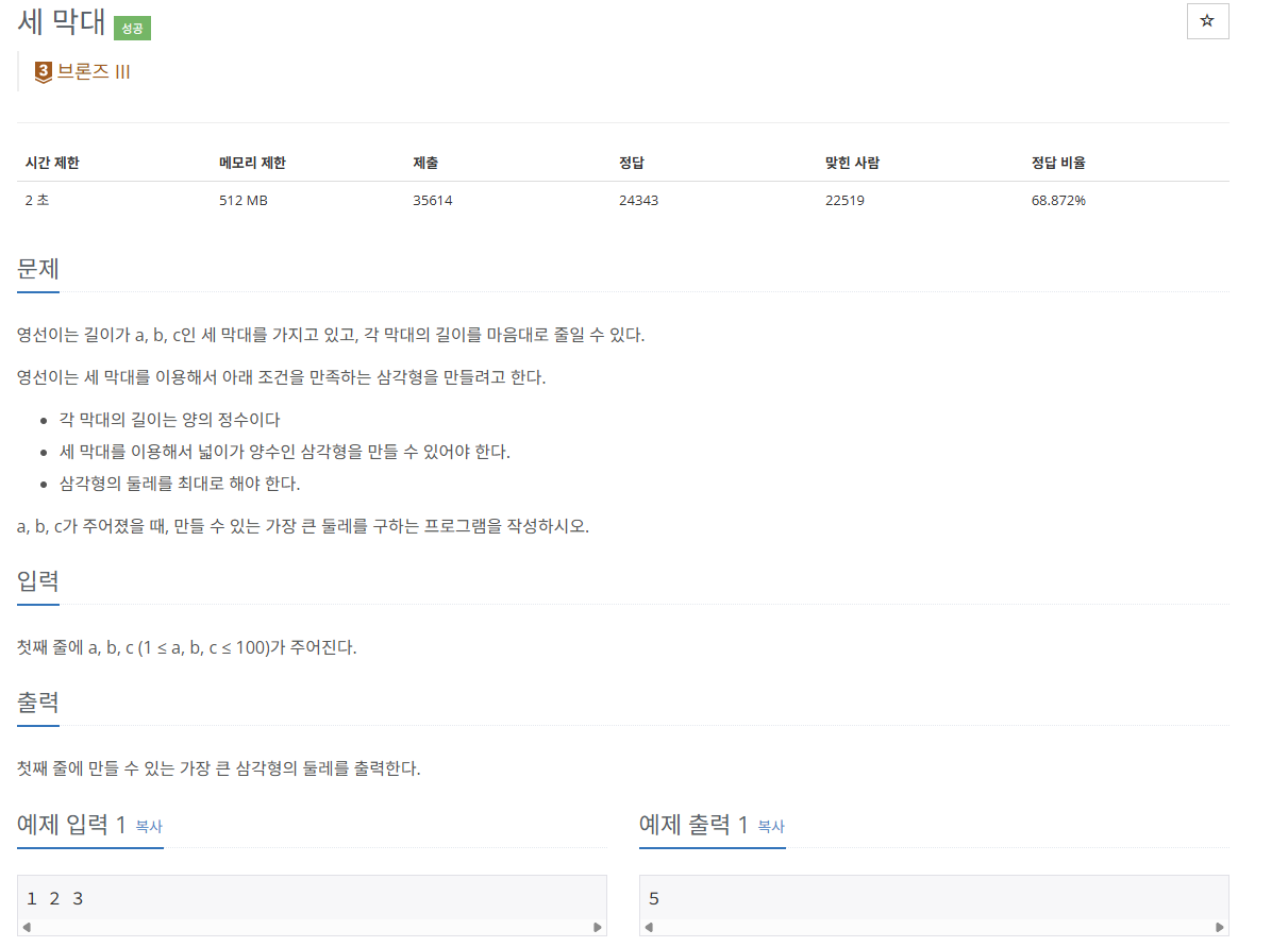 이번 문제는 세 막대의 길이가 주어졌을 때 삼각형이 성립하는지 확인하고,