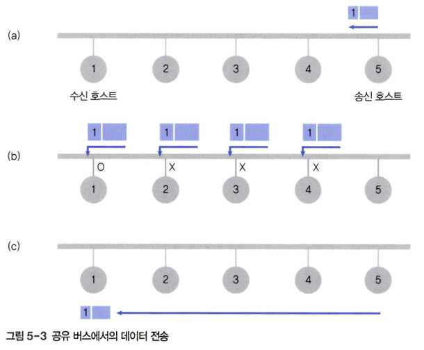 - 컴퓨터 네트워크에서 가장 많이 사용하는 이더넷은 공유 버스를 이용해 호스트를 연결한다.
