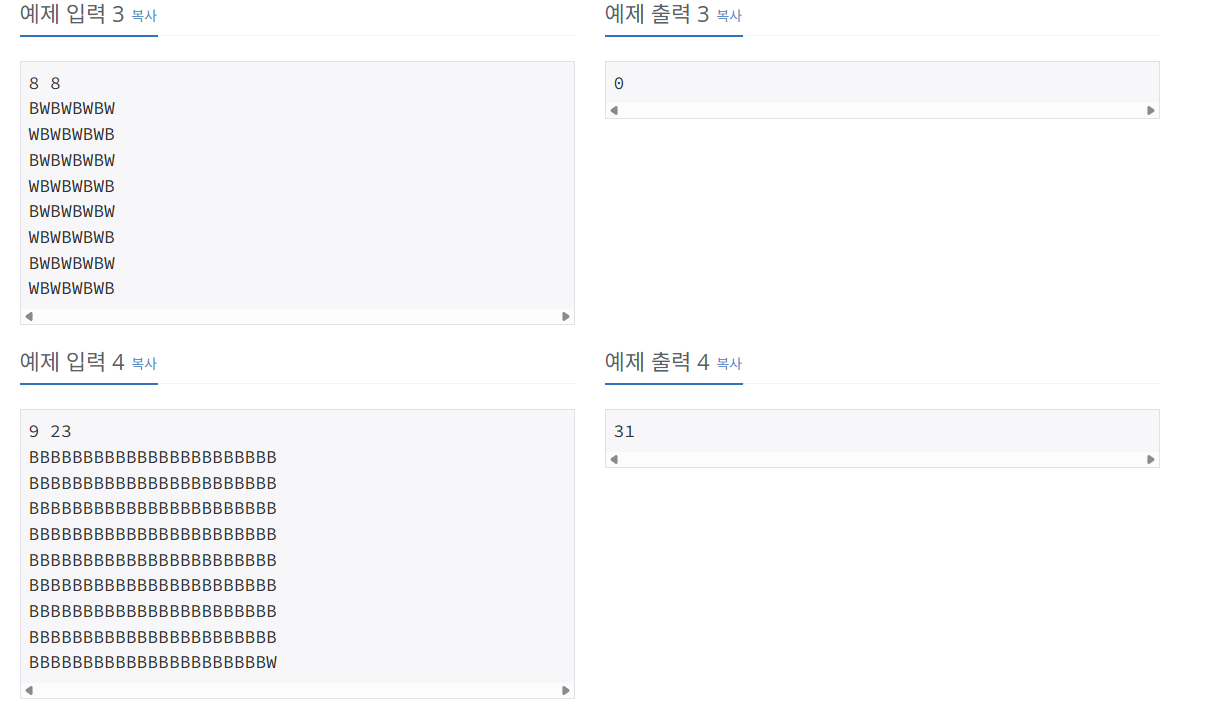 하지만 8 × 8 범위의 체스판을 검사하면서 최소로 다시 칠해야 하는 칸의 수를 구하는 과정에서 범위를 어떻게 설정해야 할지 감을 잡지 못했다. 특히 전체 N × M 체스판에서 어떤 위치를 기준으로 8 × 8 영역을 검사해야 하는지에 대해 한동안 고민하게 되었다.