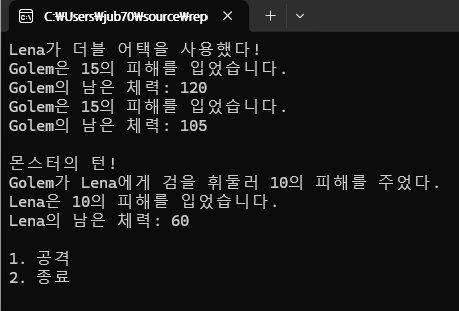 Console.WriteLine($"{charName}가 더블 어택을 사용했다!");