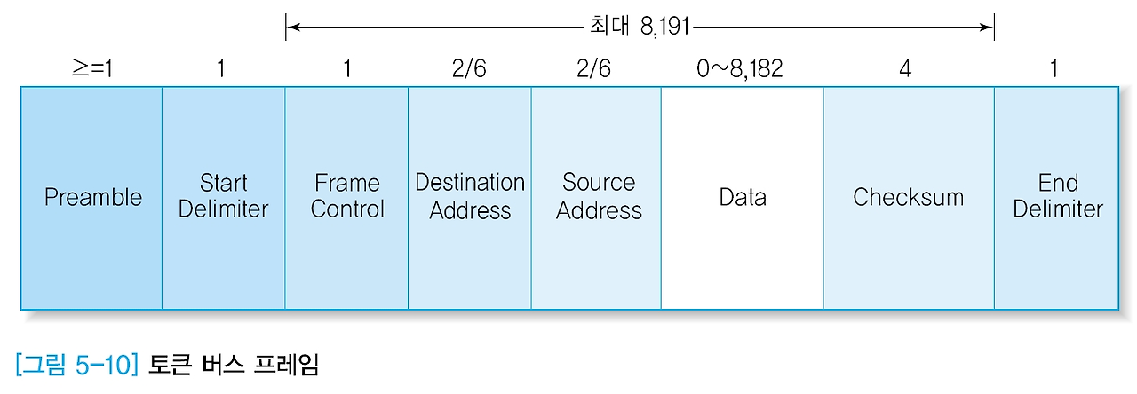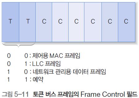 - Frame Control(프레임 제어) : 데이터 프레임과 제어 프레임을 구분해준다. 데이터 프레임에서는 프레임 우선순위와 수신 호스트의 응답 확인이 필요할 때 사용하고, 제어 프레임에서는 토큰의 전달, 링 관리와 같은 용도로 사용한다.