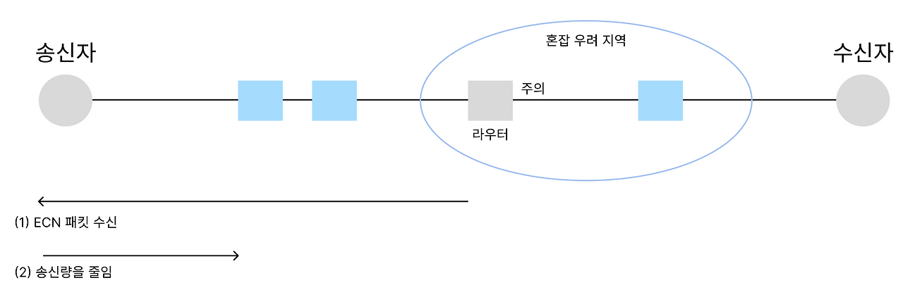 혼잡 지역에 위치한 라우터는 입력 선로로 들어온 패킷이 주의 표시된 출력 선로로 라우팅 되는 경우에 패킷의 송신 호스트에 ECN 패킷을 전송한다 (1).
