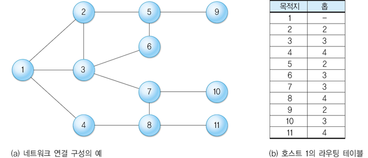 A와 같은 네트워크 연결 구성의 예에서 호스트 1이 관리하는 라우팅 테이블의 정보는 b와 같다. 라우팅 테이블 정보는 네트워크에 연결된 모든 호스트에 존재하며, 호스트마다 관리하는 정보의 내용은 다르다.