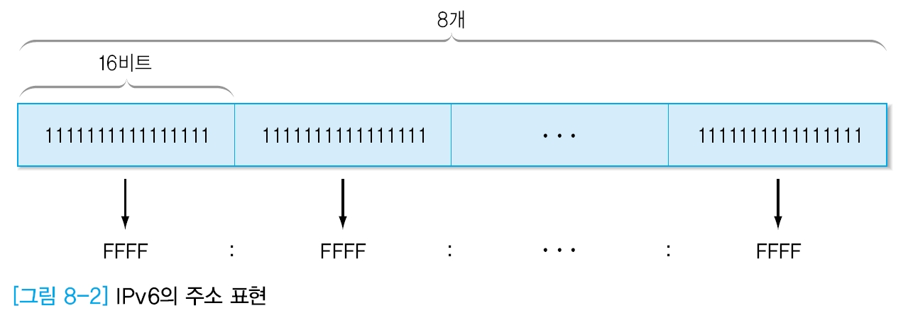 IPv4에서는 8비트 단위의 숫자 4개를 점(.)으로 구분하여 211.223.201.30과 같이 표현했다. 그러나 IPv6에서 지원하는 128비트의 숫자는 아주 커 16비트의 숫자 8개를 콜론으로 구분한다.