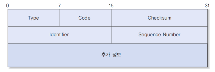 - Type(유형) : 1바이트 크기로 메시지의 종류를 구분한다. Type + Code 필드로 메시지를 구분하는데, 오류 보고 메시지에는 DESTINATION UNREACHABLE, SOURCE QUENCH, REDIRECTION, TIME EXCEEDED, PARAMETER PROBLEM 등이 있으며, 질의 메시지에는 ECHO REQUEST, ECHO REPLY, TIMESTAMP REQUEST, TIMESTAMP REPLY 등이 있다.