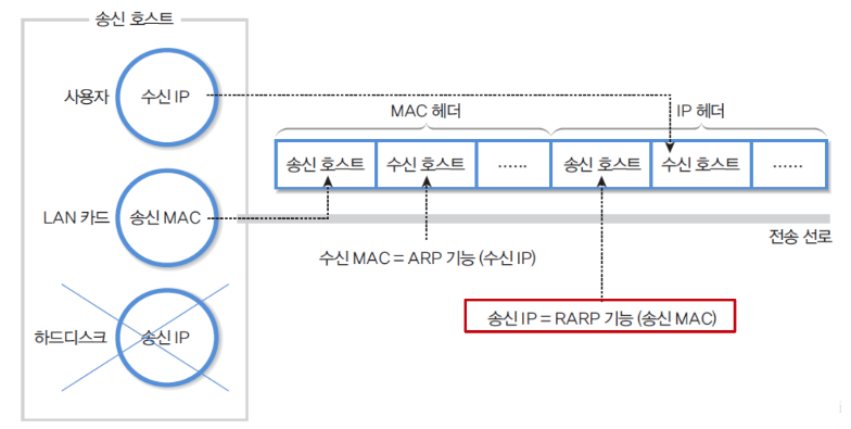 파일 시스템이 없는 호스트는 자신의 IP주소를 보관할 방법이 없다. 따라서 LAN 카드에 내장된 MAC 주소를 매개변수로 하여 RARP 기능을 수행함으로써 자신의 IP주소를 얻어야 한다.