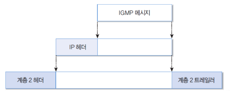 즉, IGMP 메시지는 IP프로토콜의 데이터로 처리되기 때문에 IP 패킷의 헤더에 실려서 계층 2 프로토콜로 전달된다.