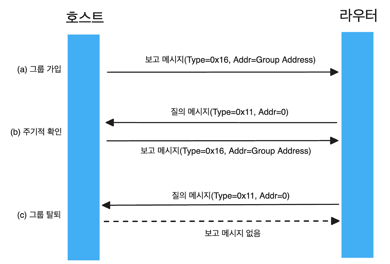멀티 캐스트 라우터가 그룹에 속한 멤버 목록을 유효하게 관리하려면 IGMP 질의 메시지를 사용해 주기적으로 확인하는 과정이 필요하다.