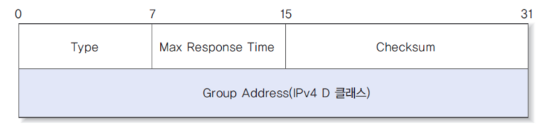- Group Address : 질의 메시지는 0으로 채우고, 보고 메시지에는 호스트가 가입을 원하는 그룹 주소를 표기한다. 특정 그룹 관련 질의 메시지에는 해당 그룹의 주소를 표기한다.
