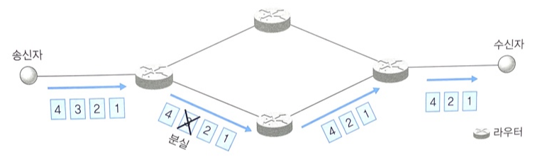 송신 프로세스가 전송한 데이터그램 네 개가 첫 번째 라우터에서 두 번째 라우터로 전송되는 과정에서 3번 데이터그램에 오류가 발생하여 다음 라우터에 도착하지 못한 현상이다.