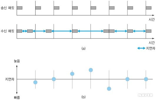 전송 간격이 균일했던 송신 데이터그램이 수신 프로세스에 도착할 때 간격이 일정하지 않음을 보여준다. 이러한 송수신 프로세스 사이의 데이터그램 간격 차이를 b에 표시했는데, 이 분포를 지터라 한다.