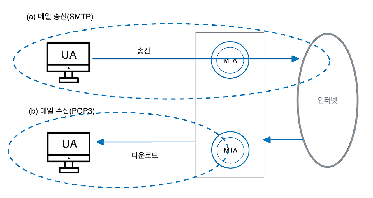 UA와 MTA의 연동을 위해 사용하는 SMTP와 POP 서비스 간의 관계는 위와 같다.