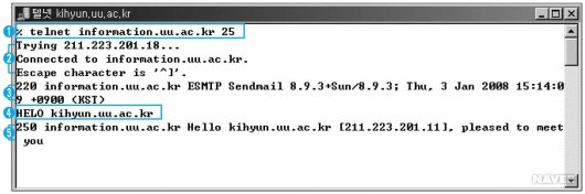 - 클라이언트 호스트에서 'telnet information.uu.ac.kr 25' 명령을 입력하여 information.uu.ac.kr의 25번 포트인 SMTP 서버에게 연결을 시도한다.