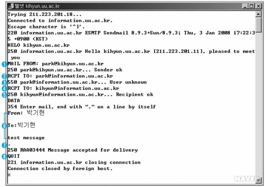 - 호스트 information.uu.ac.kr에는 park이라는 사용자가 등록되어 있지 않으므로 '550 park@information.uu.ac.kr... User unknown'이라는 오류 응답이 회신되었다.