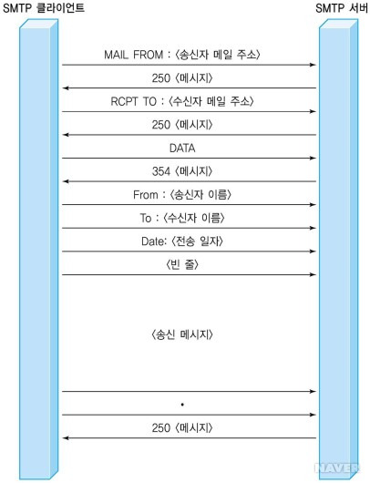 - 인터넷에서 전자 메일 전송은 SMTP(Simple Mail Transfer Protocol)를 지원하는 호스트 사이에 이루어지며, SMTP 호스트들은 SMTP 명령과 그에 따른 응답 과정을 반복해 메일을 전송한다.