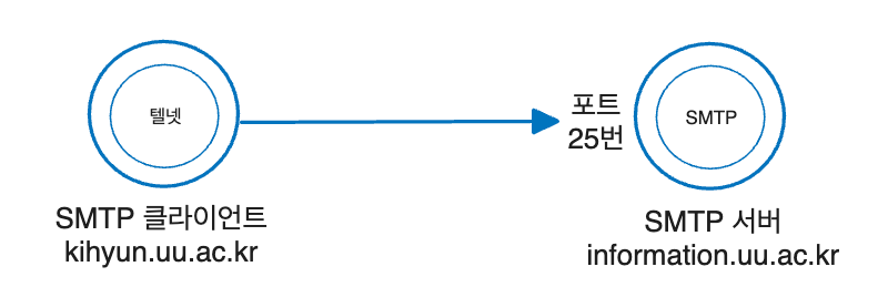 왼쪽의 텔넷 프로그램이 SMTP 클라이언트를 대신한다. 텔넷 프로그램은 키보드의 입력을 SMTP 서버에 전달하고 SMTP 서버의 결과를 화면으로 출력하는 중개 기능만 수행한다.