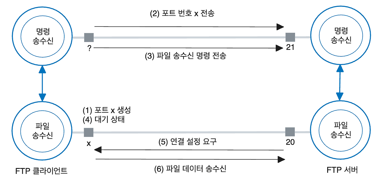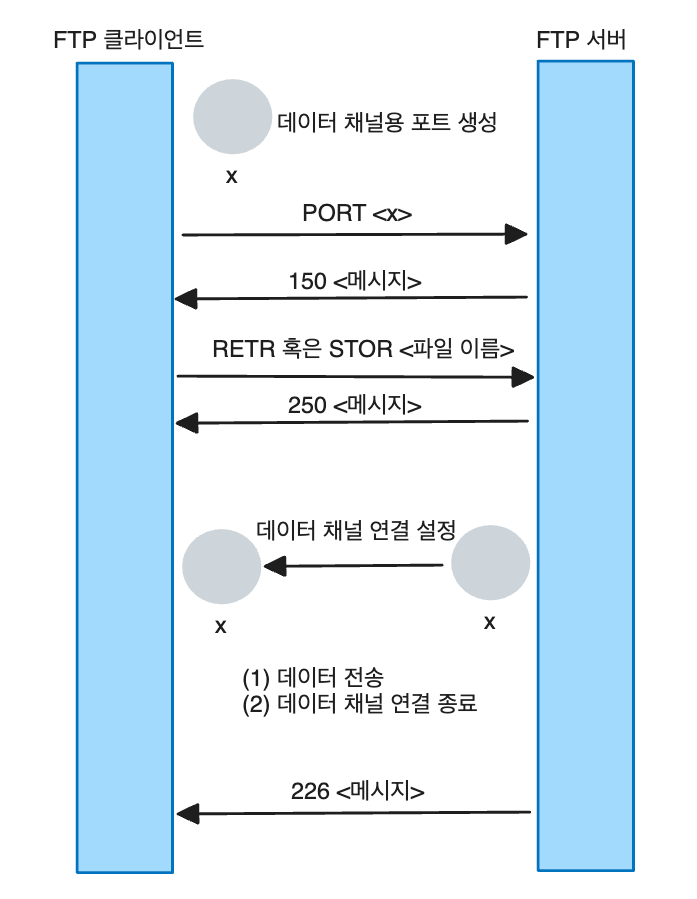 - 생성된 포트 x를 서버에 전송하려고 PORT 명령을 사용하는데, 이 과정은 제어 채널을 통해 이루어진다.