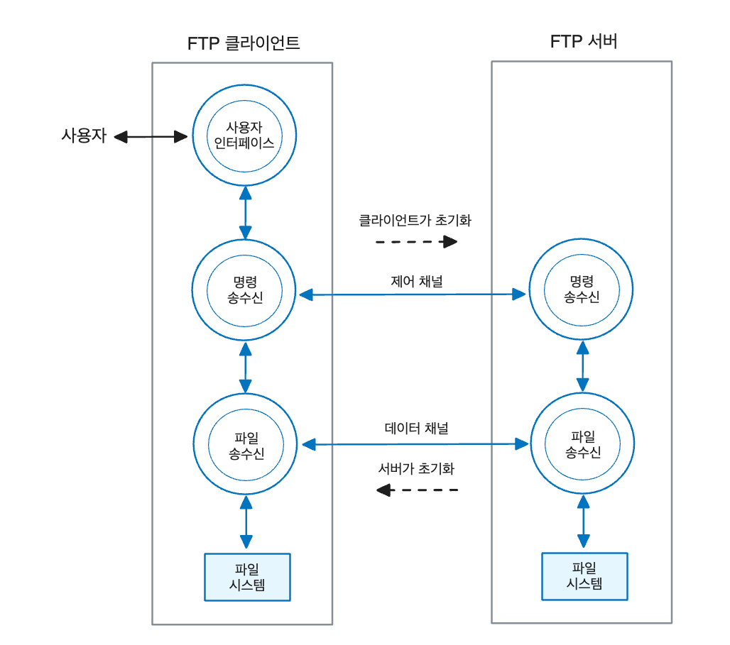 원으로 표시한 모듈은 별도의 프로세스가 아니다. 또한 클라이언트와 서버는 개별 프로그램으로 작성되므로 이 둘은 독립적인 하나의 프로세스로 실행된다. 그림에서 주의할 점은 데이터 채널의 경우 연결 설정 요구가 FTP 클라이언트가 아니라 fTP 서버에서 발생한다는 점이다. 즉, FTP 클라이언트가 get이나 put 명령으로 파일의 송수신을 요청하면 FTP 서버가 해당 파일을 전송하기 위한 데이터 채널을 설정한다. 이때 FTP 클라이언트는 미리 정해진 포트에서 대기 상태로 들어가기 때문에 FTP 서버의 연결 요청을 받을 수 있다. 참고로 FTP에서 제어 채널과 데이터 채널의 연결은 다른 인터넷 응용 프로그램 처럼 소켓 기능을 이용한다.