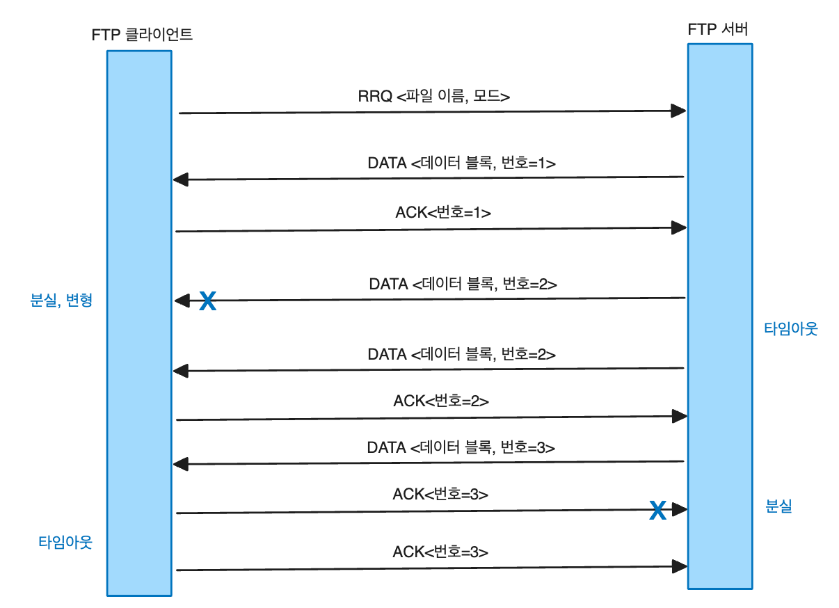 - 마지막 3번 데이터 블록은 ACK 메시지가 전송 과정에서 분실된 경우이다. TFTP 서버는 클라이언트로부터 ACK 메시지를 수신하지 않았기 떄문에 다음에 전송할 데이터의 송신을 시작할 수 없다. 4번 데이터 블록이 전송되지 않았으므로 TFTP 클라이언트에서 타임아웃 기능을 통해 ACK 메시지를 재전송한다.