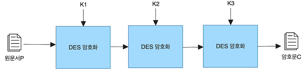 3DES 알고리즘은 암호화 과정에서 각각 56비트 크기인 3개의 DES 키(K1, K2, K3)를 사용한다. 즉, 키 K1을 이용하여 DES 암호화, 키 K2를 이용하여 DES 해독, 키 K3를 이용하여 DES 암호화 기능을 수행한다.