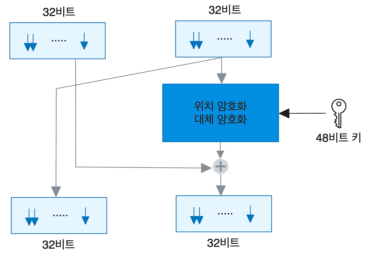 - 오른쪽 출력의 32비트 계산은 조금 복잡하다. 암호화를 위해 48비트의 암호키와 32비트의 입력을 이용한다.