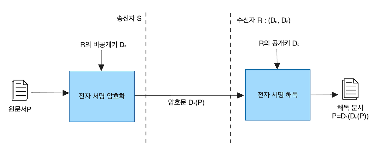 - 수신한 문서를 RSA 알고리즘의 비공개키 Rs로 해독함으로써 전자 서명문 Ds(P)를 얻는다.