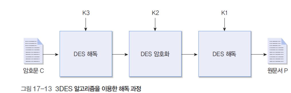 해독 과정은 반대의 절차로 이루어진다. 즉, 키K3를 이용하여 DES 해독, 키 K2를 이용하여 DES 암호화, 키 K1을 이용하여 DES 해독 기능을 수행한다.