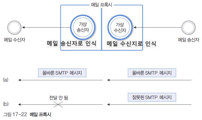 - 중간에 있는 프록시는 메일 시스템이라는 응용 서비스 기능을 구현하기 때문에 메일 송신자가 전송한 SMTP 메시지를 해석할 수 있다. 따라서 잘못된 메시지는 프록시가 차단하므로 메일 수신자가 올바르게 처리할 수 있는 메시지만 전달된다.