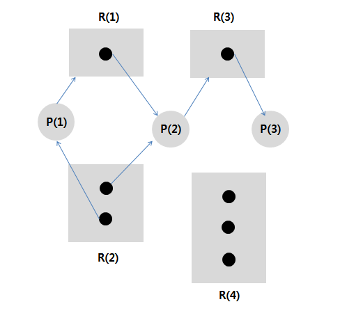 - 에지(E) = {(P1, R1), (P2, R3), (R1, P2), (R2, P2), (R2, P1), (R3, P3)}