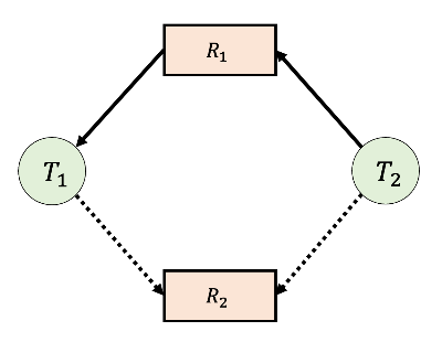 - 유형별 자원의 개수가 오직 하나일 경우에는 자원 할당 그래프에 사이클이 존재하면 사이클에 속해있는 프로세스는 반드시 교착상태임을 알 수 있었다. 이러한 사실을 이용하여 대기 그래프를 이용한 알고리즘은 유형별 자원의 개수가 오직 하나 존재하는 시스템일 경우에 교착상태 발생과 교착상태의 프로세스를 탐지하는 것이다.