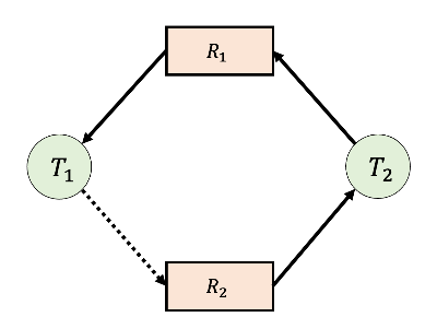 - 대기 그래프는 자원 할당 그래프에서 자원에 해당된 노드를 삭제하고 오직 프로세스들 간의 대기 관계를 나타내는 그래프이다.