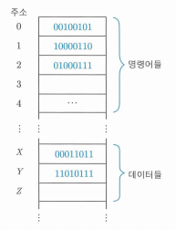 - 기계어들은 0번지부터 저장되어 있고, 계산에 사용될 데이터들은 각각 x번지와 y번지에 저장되어 있다.(실제로는 기억장소들의 주소도 2진수로 표현된다.)