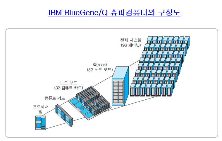 위의 슈퍼컴퓨터의 구성도를 보면 전체적으로 1,572,864개의 PowerPC 프로세서를 이용하며 최고 속도가 20 PFLOPS인 대규모 병렬컴퓨터이다.[GIL13]. 이 시스템의 구성에서는 16개의 프로세서 코어들을 포함하고 있는 프로세서 칩이 기본 요소로 사용된다. 컴퓨트카드는 한 개의 프로세서 칩 모듈과 16GByte DDR3 기억장치로 이루어지며, 노드 보드에는 32개의 컴퓨트 카드들이 장착된다.