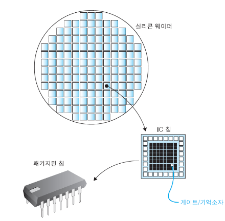 - 이 사각형 평판 위에 동일한 회로 패턴을 집적(integrate)시키면 여러 개의 게이트들을 포함하는 IC 칩이 제조되는 것이다. 그런 다음 이 칩의 회로 부분을 보호하기 위해 플라스틱과 같은 재료를 이용하여 패키징 한 다음에, 외부와의 연결을 위한 핀(pin)들을 부착한다.