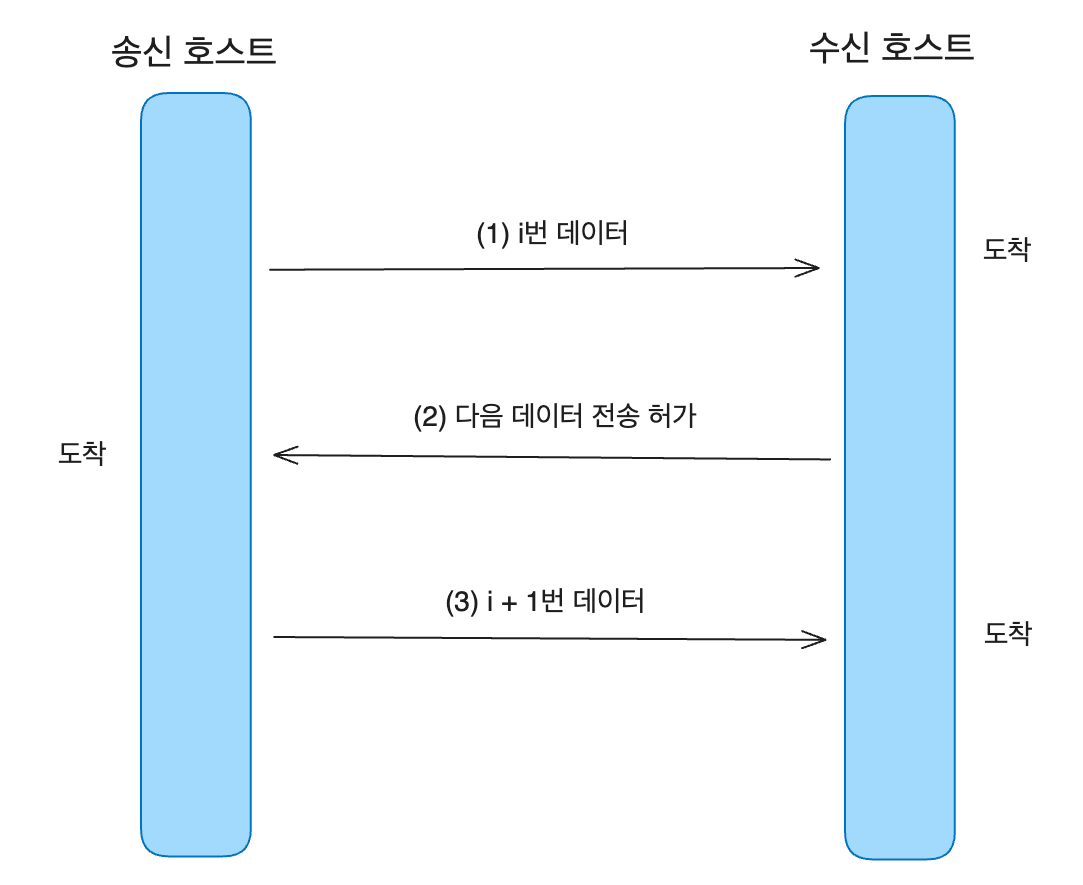 송신 호스트가 데이터를 전송하려면 반드시 수신 호스트로부터 명시적인 전송 허가를 받아야 한다. 송신 호스트가 i번째 데이터를 보내고 수신 호스트가 이를 제대로 받는다. 이후에 송신 호스트가 i+1번째 데이터를 보내려면 수신 호스트의 전송 허가가 필요하다. 수신 호스트는 데이터를 수신할 여력이 있을 경우에만 전송허가를 보낸다. 위 이미지에서는 전송 허가와 수신한 후에 송신 호스트가 다음 데이터인 i+1을 전송하고 있다. 이와 같이 흐름 제어 기능은 보통 수신 호스트의 제어에 의해 이루어진다.