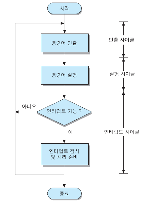 CPU는 각 명령어의 실행 사이클을 종료하고 다음 명령어를 위한 인출 사이클을 시작하기 전에, 인터럽트 요구 신호가 들어와서 대기 중인지 검사해야 한다.