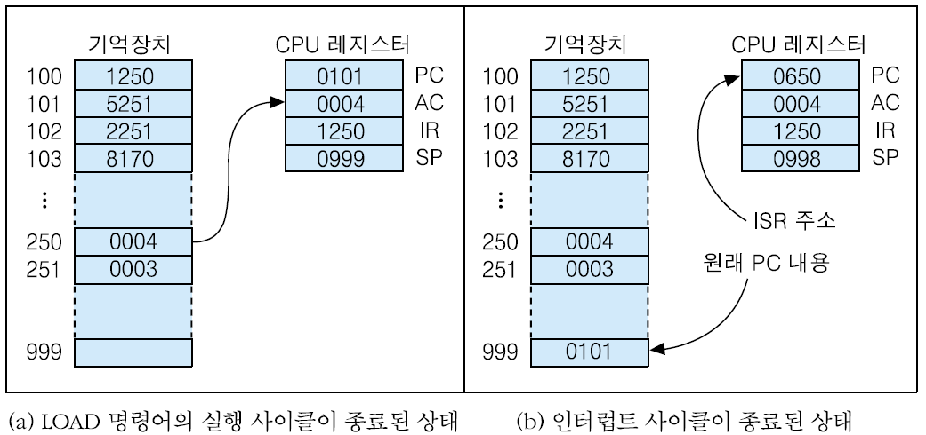 - 두번째 주기에서는 SP의 내용이 MAR을 통하여 주소 버스로 나가게 되며, PC에는 인터럽트 서비스 루틴의 시작 주소가 적재된다.