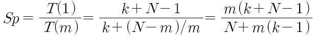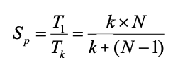 즉, 첫 번째 명령어를 실행하는 데는 k주기가 걸리고, 나머지 (N-1) 개의 명령어들은 각각 한 주기씩만 소요된다. 만약 파이프라인이 되지 않았다면 N개의 명령어들을 실행하는 데는 K x N 주기가 걸리므로, 파이프라이닝을 이용함으로써 얻을 수 있는 속도 향상(Sp)은 다음과 같아진다.