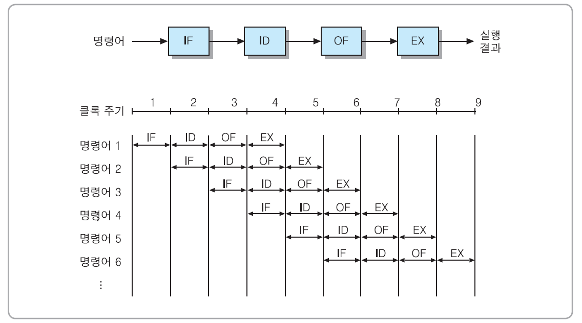 - 이것은 명령어를 실행하는데 사용되는 하드웨어를 여러 개의 독립적인 단계들로 분할하고, 그들로 하여금 동시에 서로 다른 명령어들을 처리하도록 함으로써 CPU의 성능을 높여주는 기술을 말한다.