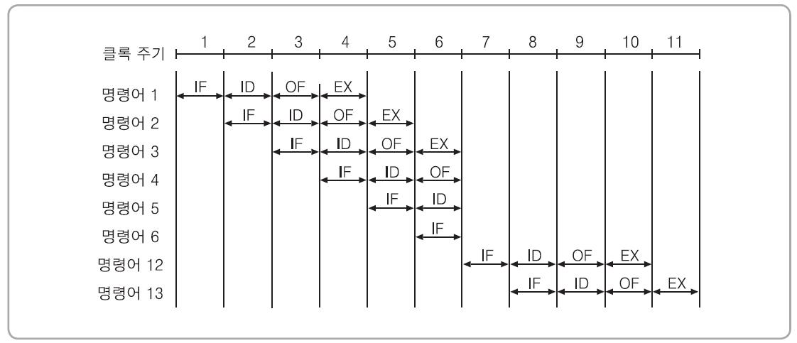 - 각 명령어의 실행에 걸리는 시간은 모두 두 주기씩이지만, 파이프라이닝의 특성에 의해 두 번째 명령어부터는 한 주기만에 실행이 완료되는 것과 같은 효과를 얻을 수 있다.