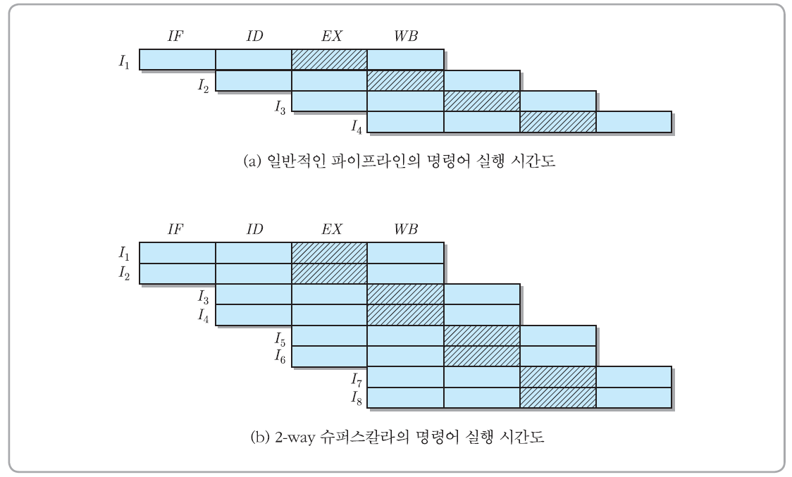 a와 동일한 파이프라인 구조를 가진 명령어 유니트를 두 개 포함하고 있는 슈퍼스칼라 프로세서의 명령어 실행에 대한 시간 흐름도를 보여주는데, 이와 같이 두 개의 파이프라인들로 이루어진 구조를 2-way 슈퍼스칼라라고 부르는데, 이 경우 매 주기마다 명령어가 두 개씩 인출되어 동시에 처리되는 것을 확인할 수 있다.